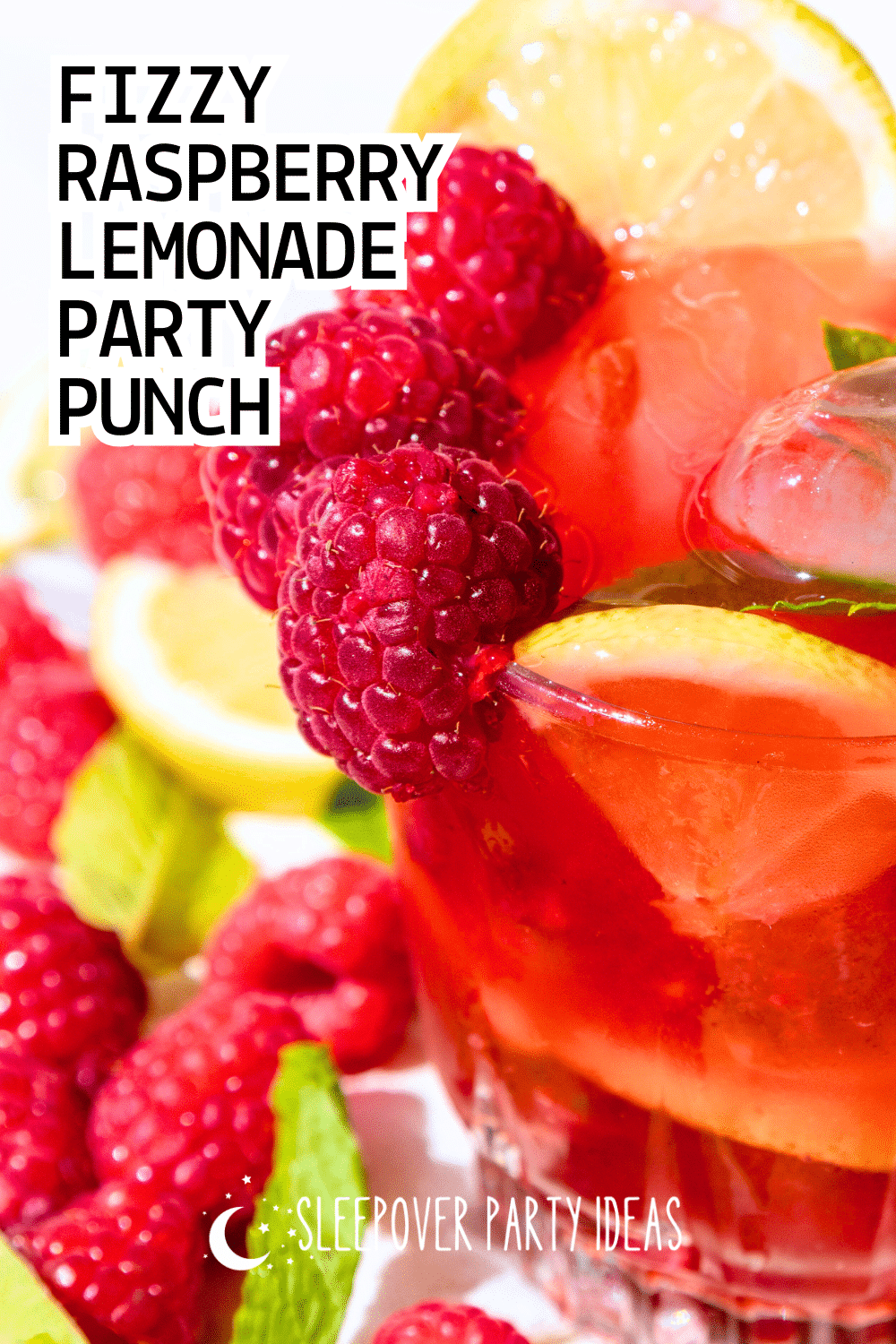 Fizzy Raspberry Lemonade Party Punch in a glass on a party table with raspberry drink garnish and lemon slices